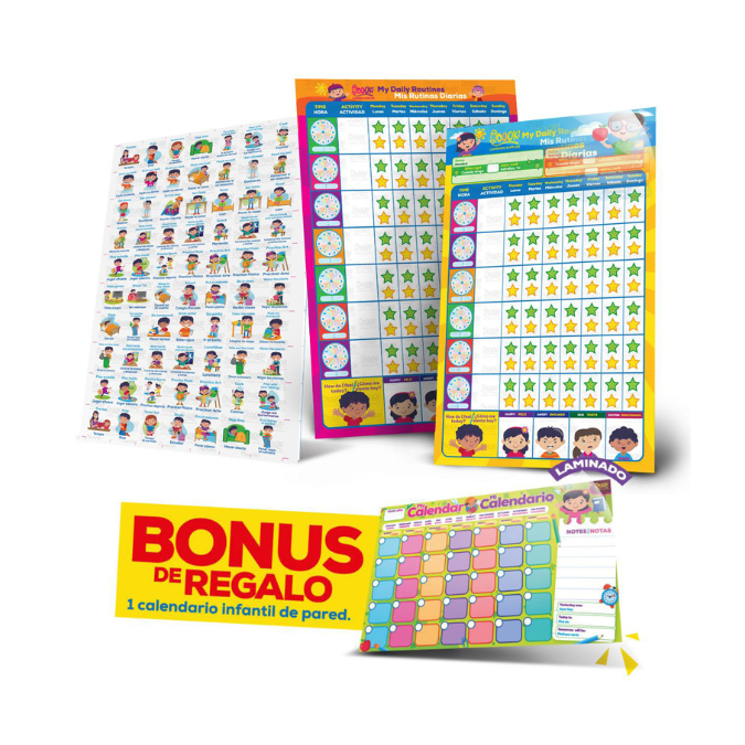 Incluye: Más de 50 actividades ilustradas de rutinas diarias y responsabilidades. 2 Afiches de planificadores semanales laminados (Una para actividades de la mañana y otra para las actividades de la tarde). Bonus: 1 calendario infantil de pared para planificar mensual, en material laminado para escribir y borrar. Cinta adhesiva de doble cara para pegar el afiche a la pared. Imánes con adhesivo para pegar las tarjetas de rutina al afiche. 2 marcadores de pizarrón. Bolsa ziplock para guardar las tarjetas de actividades. Hoja con instrucciones e ideas de uso.